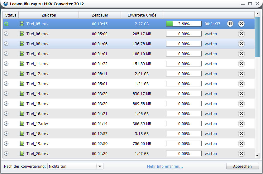 Da mit dem Blu-ray zu MVK Converter Sie Blu-ray verlustfrei ins MKV-Format konvertieren können, können Sie die originale Datei deshalb nicht wie die anderen Leawo Produkten bearbeiten.