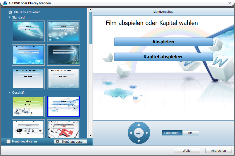 Klicken Sie auf die Kreisschaltfläsche am unteren Rand, um den Brennvorgang fortzusetzen.In dem sich öffnenden fenster können Sie Ihr originelles Blu-ray-Menü gestalten. Wählen Sie aus den knapp 50 intergrierten professionellen DVD Menüvorlagen eine beliebige aus.