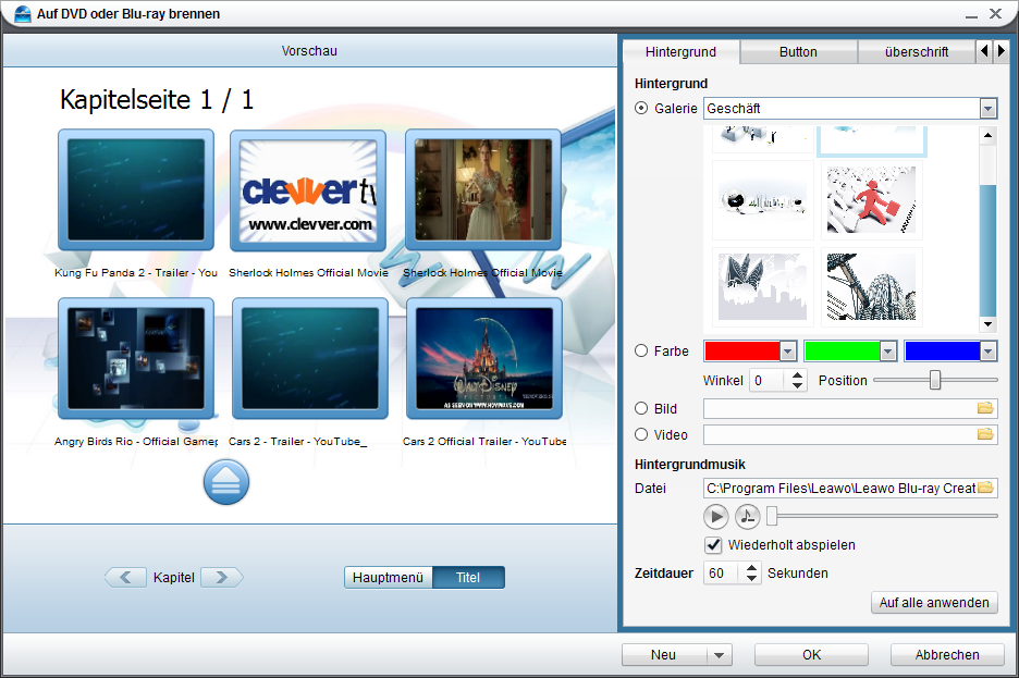 Zusätzlich unterstützt der Leawo Blu-ray Brenner die 3D-Konvertierung, das Zuschneiden und Abschneiden von Videos, die Verwendung von eigene Fotos als Hintergundbild und Audio als Hintergrundmusic, sowie die Einstellung von Untertitel usw..