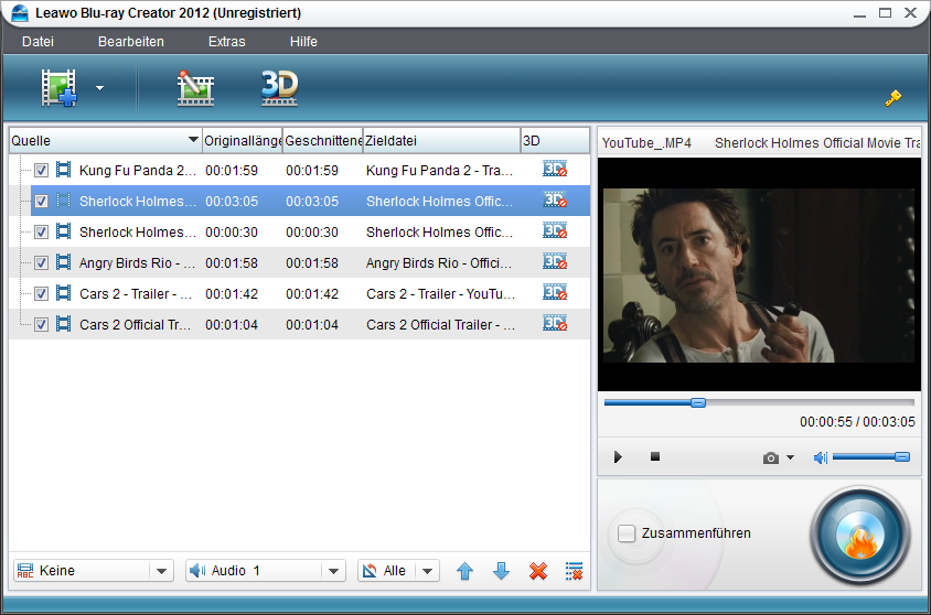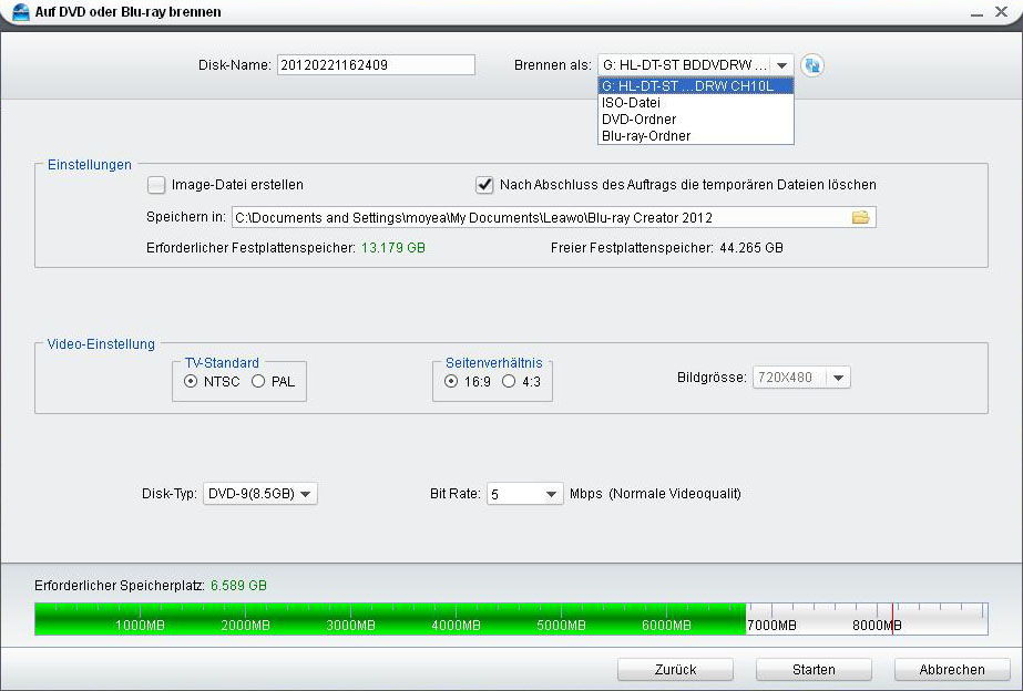 Machen Sie sich keine Sorge dafür, mit dem Leawo Blu-ray Creator 2012 sind alle solche Probelme unkompliziert zu lösen. Leawo Blu-ray Creator 2012 ist ein geniales Brennprogramm, das Ihnen ermöglicht, mit wenigen Klicks Ihre Lieblingsvideoclips mit Menü entweder in Blu-ray ISO-Imags zu konvertieren oder direkt auf Blu-ray Discs zu brennen, damit Sie die wertigen Videos einerseits sicherstellen, andererseits im normalen Blu-ray Player ansehen können.