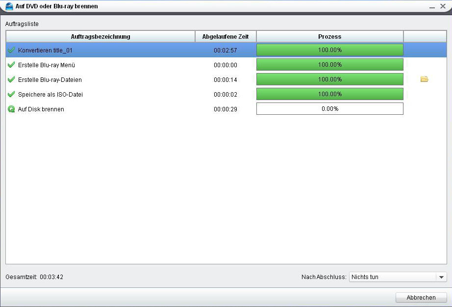 Starten Sie das Brennen mit einem Klick auf “Starten”. Die Videos werden zuerst in Blu-ray Format (m2ts) konvertiert und dann auf Disc gebrannt.