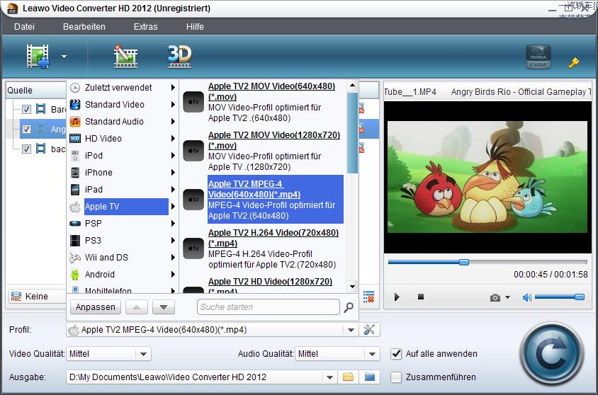 Leawo Video Converter HD ist ein umfangreicher 3D Apple TV Converter, der es ermöglicht, alle gängigen Videoformate in Apple TV kompatible Formate mit hoher Geschwindigkeit und in hochwertige Videoqualität zu konvertieren. Des weiteren ermöglicht der Apple TV Converter Ihnen, die Ausgabedateien wunschgemäß anzu passen.