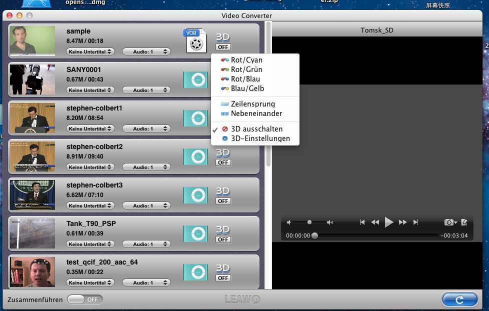 Mithilfe von Leawo Mac Produkten (Video Converter Mac, Blu-ray RipperMac, DVD Ripper Mac) können Sie 3D Filme zum Wohnzimmer bringen, weil Leawo Produkte technische Lösungen anbieten, die Ihnen ermöglicht, schnell und einfach alle 2D Videos, DVD- und Blu-ray- Filme zu 3D auf dem Mac konvertieren zu können.