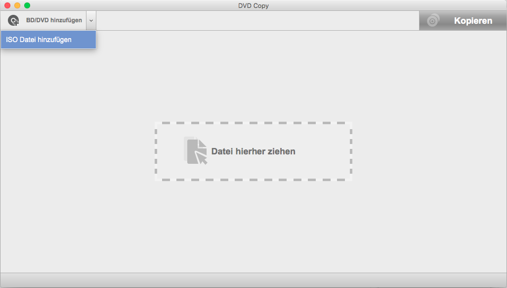 Nach dem Start von Leawo DVD Copy für Mac, klicken Sie auf das invertierte Dropdown-Symbol neben dem “BD/DVD hinzufügen” und wählen Sie “ISO-Datei hinzufügen” aus. Danach können Sie die gewünschte ISO-Datei importieren.