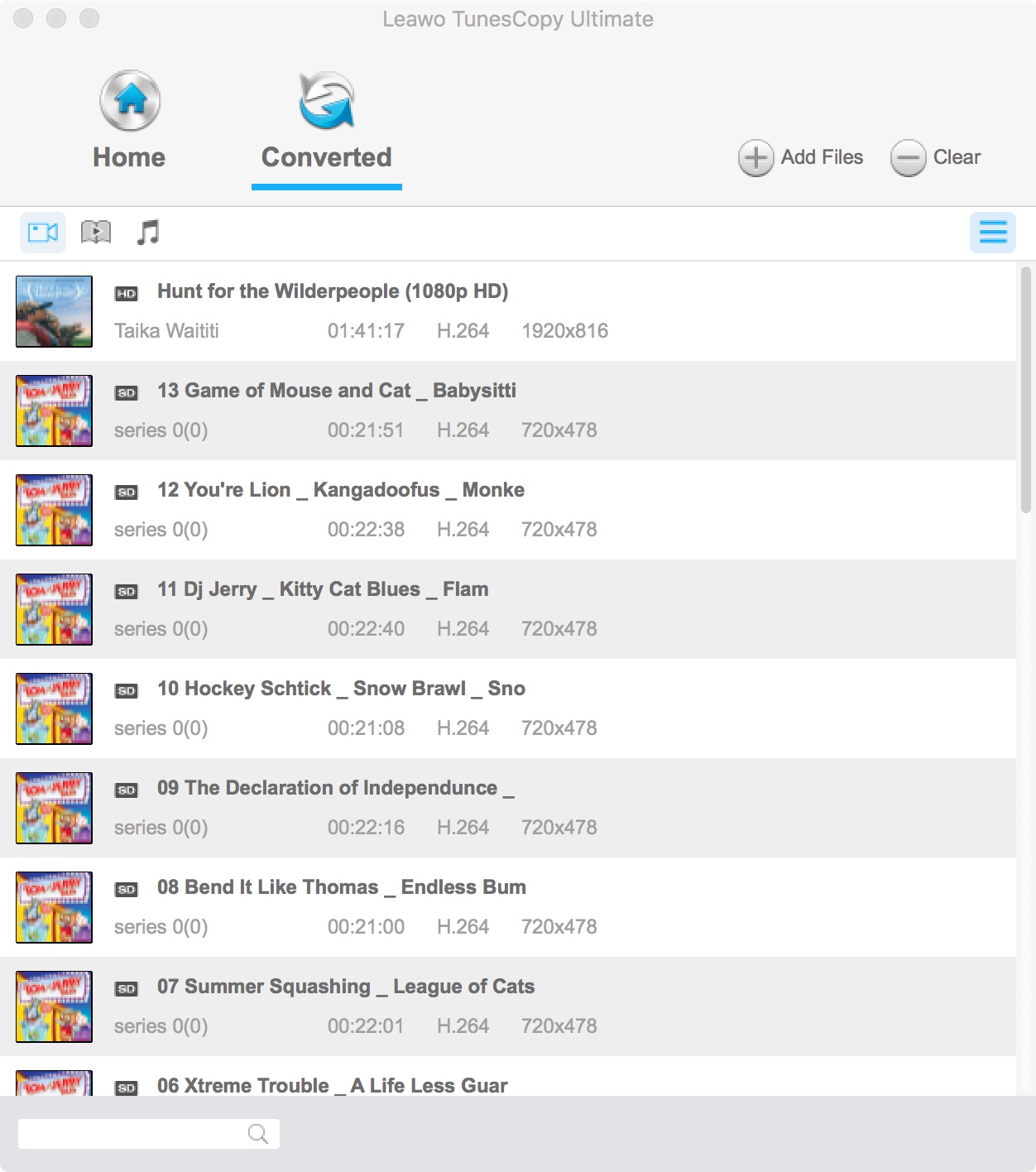 Nachdem Leawo TunesCopy Ultimate für Mac auf Ihren Mac-Computer installiert wurde, starten Sie das Programm und treten in die Hauptoberfläche ein. Sie können auf “Add Files” klicken und die gewünschten iTunes-Videos auswählen und dann auf “Add” klicken, um die M4V-Datei ins TunesCopy Ultimate für Mac zu importieren. Oder Sie können die iTunes-Videodateien direkt per Drag & Drop in das Programm ziehen.