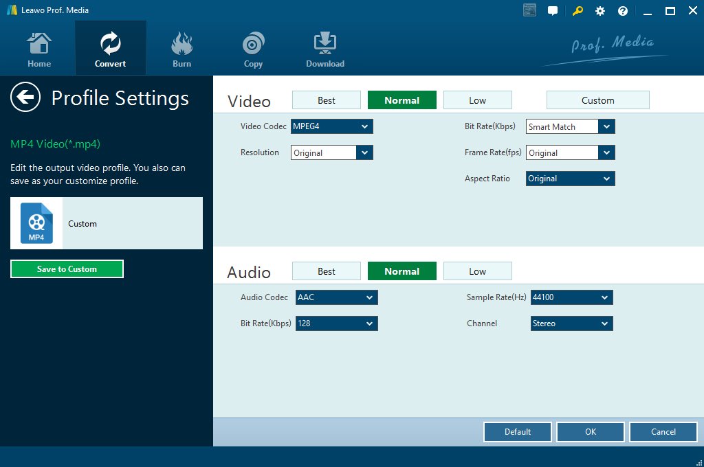 Schritt 4: MP4-Profileinstellungen anpassen. Einstellung von Video Codec und Audio Codec in vier Kategorien, nämlich: Best, Normal, Low und Custom.