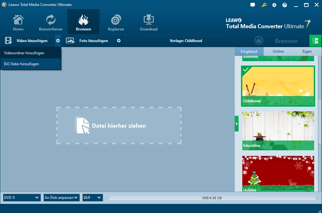 Nach dem Import von ISO-Datei, würde eine “ISO-Datei hinzufügen” Box aufspringen, dadurch Sie relevante Einstellungen durchführen: “Kopieren zu” und “Disc-Label”. Sie müssen eine leere, beschreibbare Disc in das Laufwerk einlegen und dann legen Sie es als Ziel der Kopie. Klicken Sie auf die Schaltfläche “Brennen”, um ISO Brennen zu beginnen, sobald sich die Disc in Kopieren-Feld zeigt.