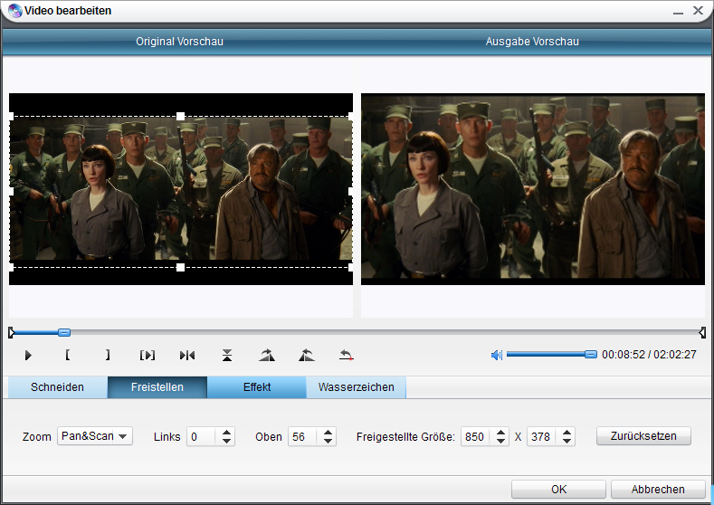 Veredeln Sie den DVD-Film mit der intergrierten Bearbeitungsfunktionen des DVD Rippers vor der Umwandlung: Video schneiden, freischalten, kleine Effekte wie Helligkeit, Kontrast,Sättigung, Lautstärke und Text- oder Bildwasserzeichen hinzufügen, wie Sie wollen.