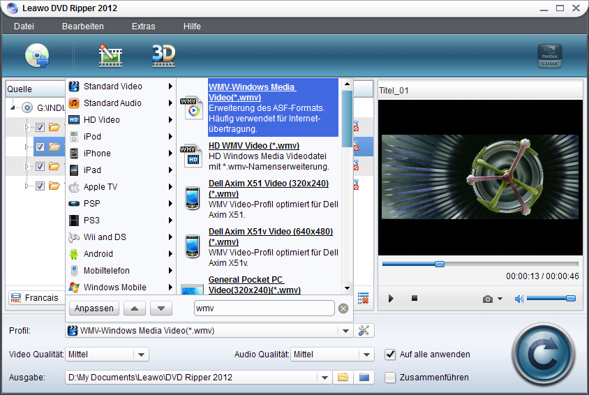 Leawo DVD Ripper ist ein professioneller DVD in WMV Converter, der fast alle DVD, egal ob die ganze DVD-Disk, Haupttitel bestimmte Schnitte oder DVD-Ordner, ISO-Dateien schnell und leicht in höchster Qualiätt in WMV umwandeln kann. Praktischerweise hat der DVD in WMV Converter auch Profile für mobile Abspielgeräte wie Zune, Crentive Zen, iRiver vorinstalliert. Darüber hinaus stellt Ihnen der DVD in WMV Converter noch mehrere praktische Bearbeitungsfunktionen für bessere Performance und Kompatibilität bereit.