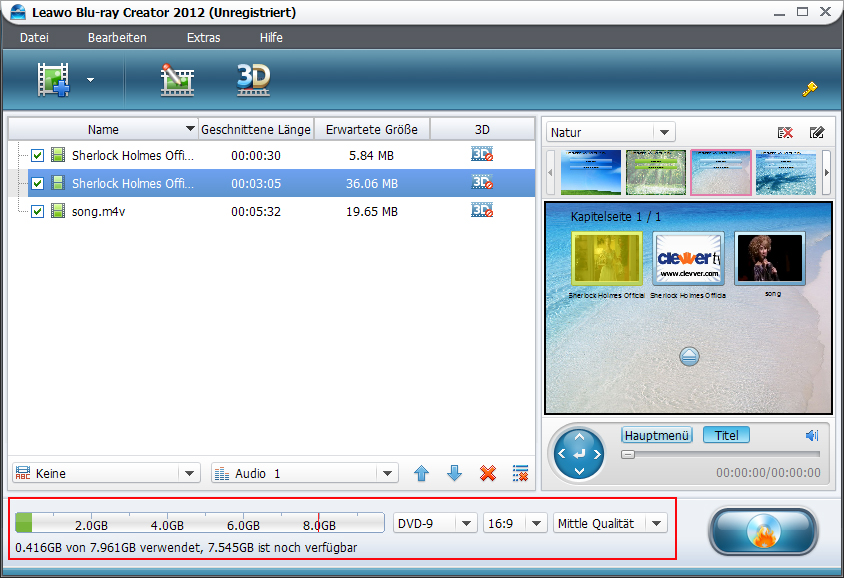 Am Unten der Haupoberfläsche können Sie sich enscheiden, ob Sie die M4V Filme als DVD-5 oder als DVD-9 mit hoher, mittler oder niedrigen Qualität auf eine Disk brennen möchten. Der verbrauchter und der freier Speicherplatz wird als Balken auf der hauptoberfläche in Echtzeit angezeigt. Darauffolgend können Sie das Brennen-Button klicken. In dem neuen Fenster brauchen Sie einige Einstellungen vornehmen. Dann können Sie das Brennen von M4V auf DVD starten. Die anderen macht der Leawo Blu-ray Creator.