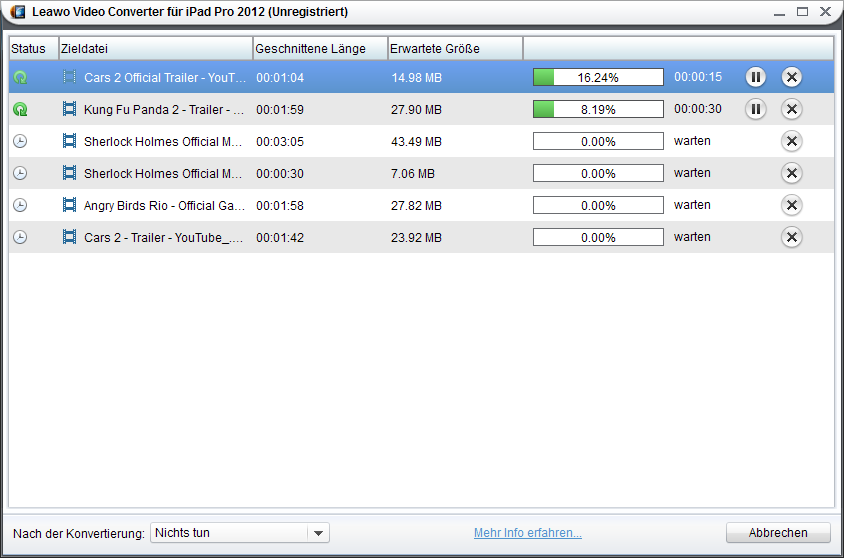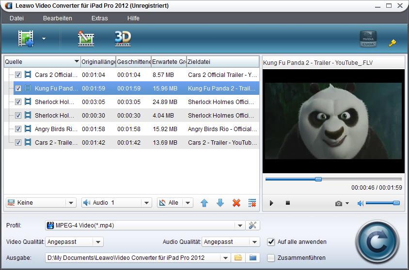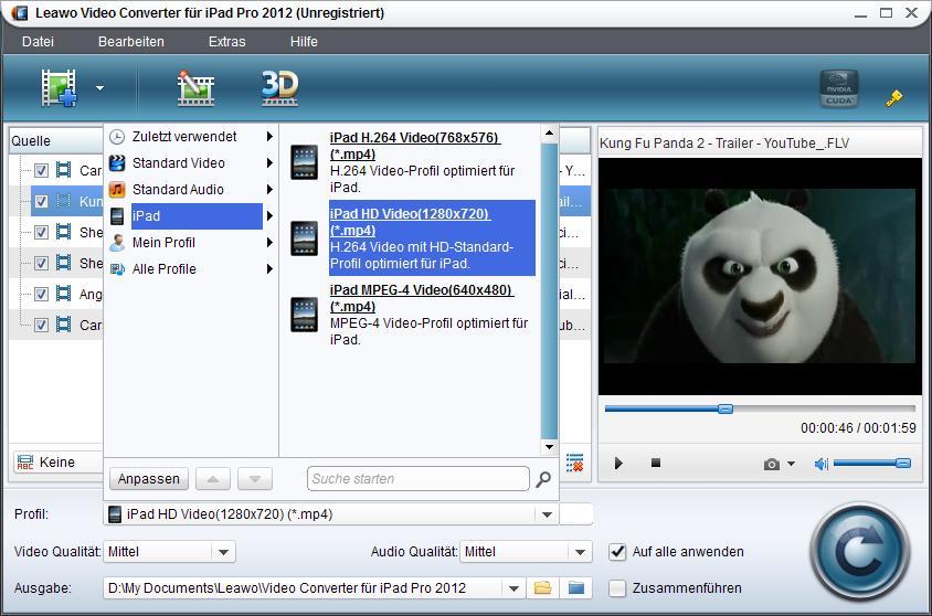 Aber um einen perfekten Displayeffekt auf Galaxy Tab P1000 zu erzielen, braucht man unbedient einen Video Converter. Und unten zeigen wir Ihnen, wie man Videos mit Leawo Video Converter für iPad 2012 kompatibel für Samsung Galaxy Tab P1000 machen kann. Wie sich der Name vermuten lässt, ist der Converter am Anfang für iPad entworft worden. Trotzdem ist es möglich, durch Anpassung der Ausgabeprofile aus den iPad-Formaten ein für das Smartphone Galaxy Tab P1000 kompatibles Format zu machen.