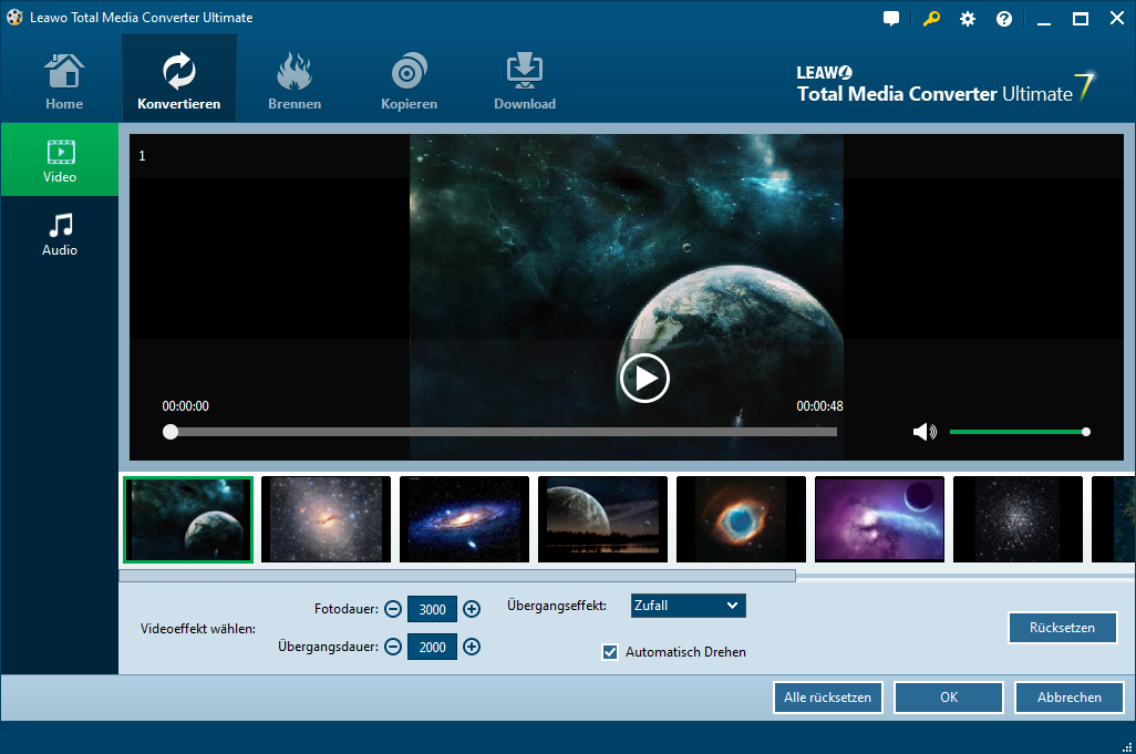 Nach dem Importieren der Fotos von der Festplatte wird dieses Programm automatisch diese Fotos in eine Foto-Diashow generieren. Klicken Sie auf das Symbol “Bearbeiten”, um die generierte Foto-Diashow zu bearbeiten. Unter dem Tab “Video”, können Sie Foto-Ordnung passen, extra Fotos einlegen, Ausgabe Video-Effekt einstellen usw.
