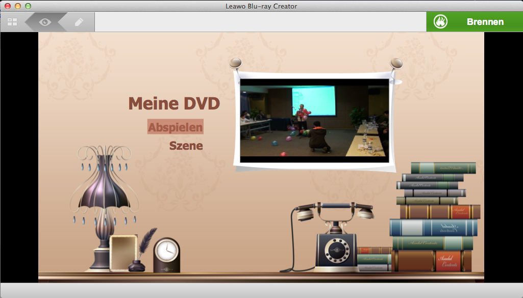 Klicken Sie auf die Taste “Abspielen” in der Mitte des Menüs, dann wird das Video, das Sie hinzugefügt haben, von Anfang an abgespielen. Klicken Sie auf die Schaltfläche “Szene” auf dem Menü, dann können Sie alle im Menü aufgeführte Kapiteln sehen.