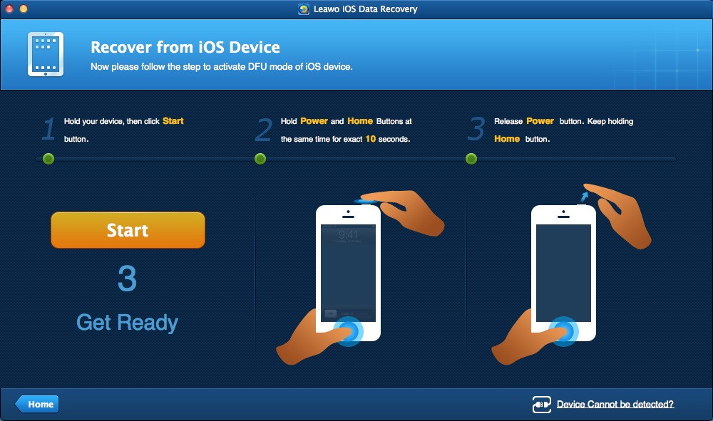 Verbinden Sie das iDevice (iPhone 4 oder iPod touch 4) mit dem MacBook über das USB-Kabel. Starten Sie dann Leawo iOS Data Recovery für Mac. Die Software zeigt ein Tutorial zur Aktivierung des DFU-Modus auf Ihrem iOS-Gerät, nachdem Ihr iDevice erkannt wird. Dann sollten Sie den DFU-Modus manuell aktivieren.