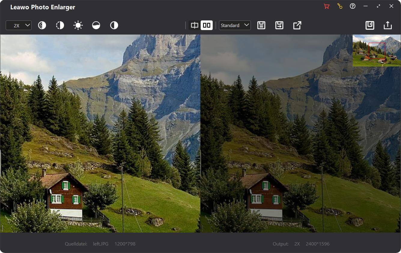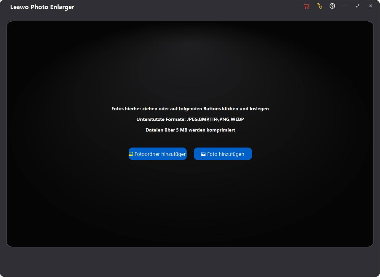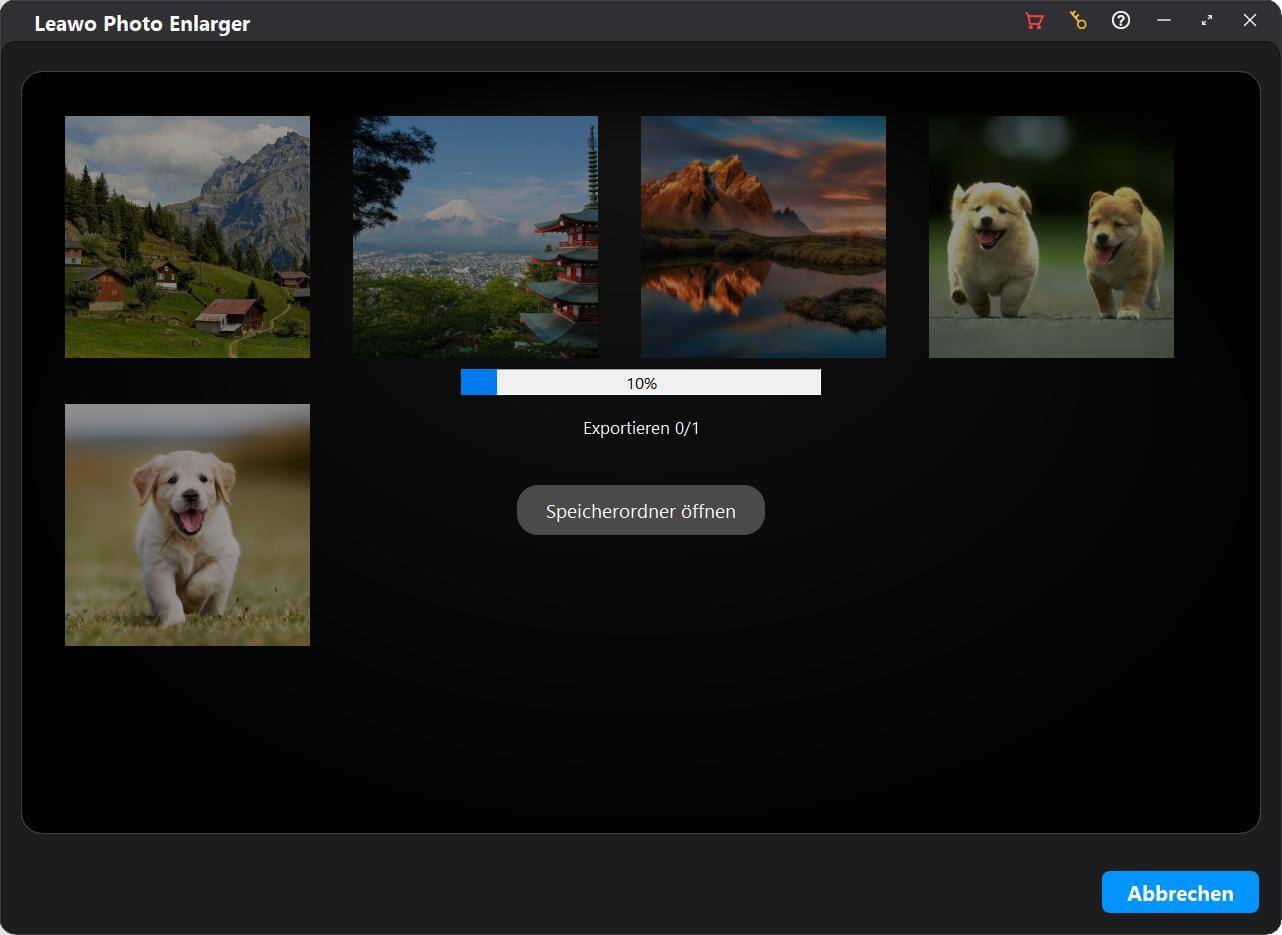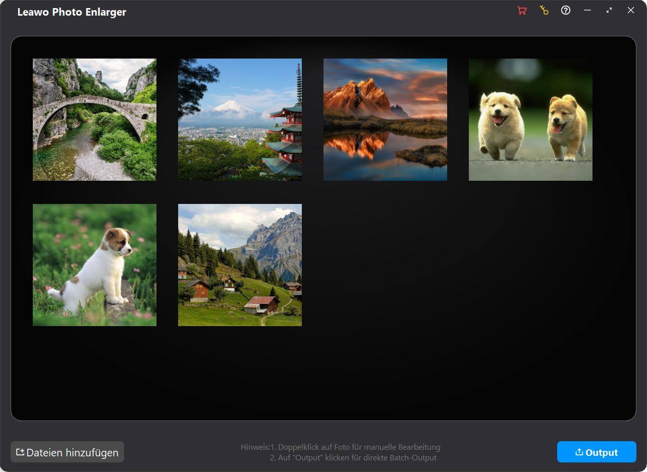 Leawo Photo Enlarger ist einfach und leicht zu bedienen. Mit nur wenigen Klicks können Sie Fotos vergrößern und die Bildauflösung erhöhen. Mit fortschrittlicher AI-Technologie wird dieser Fotovergrößerer alles schnell und intelligent für Sie tun. Die folgende Anleitung zeigt Ihnen, wie Sie mit Leawo Photo Enlarger ein einzelnes Foto bzw. mehrere Fotos bearbeiten können.