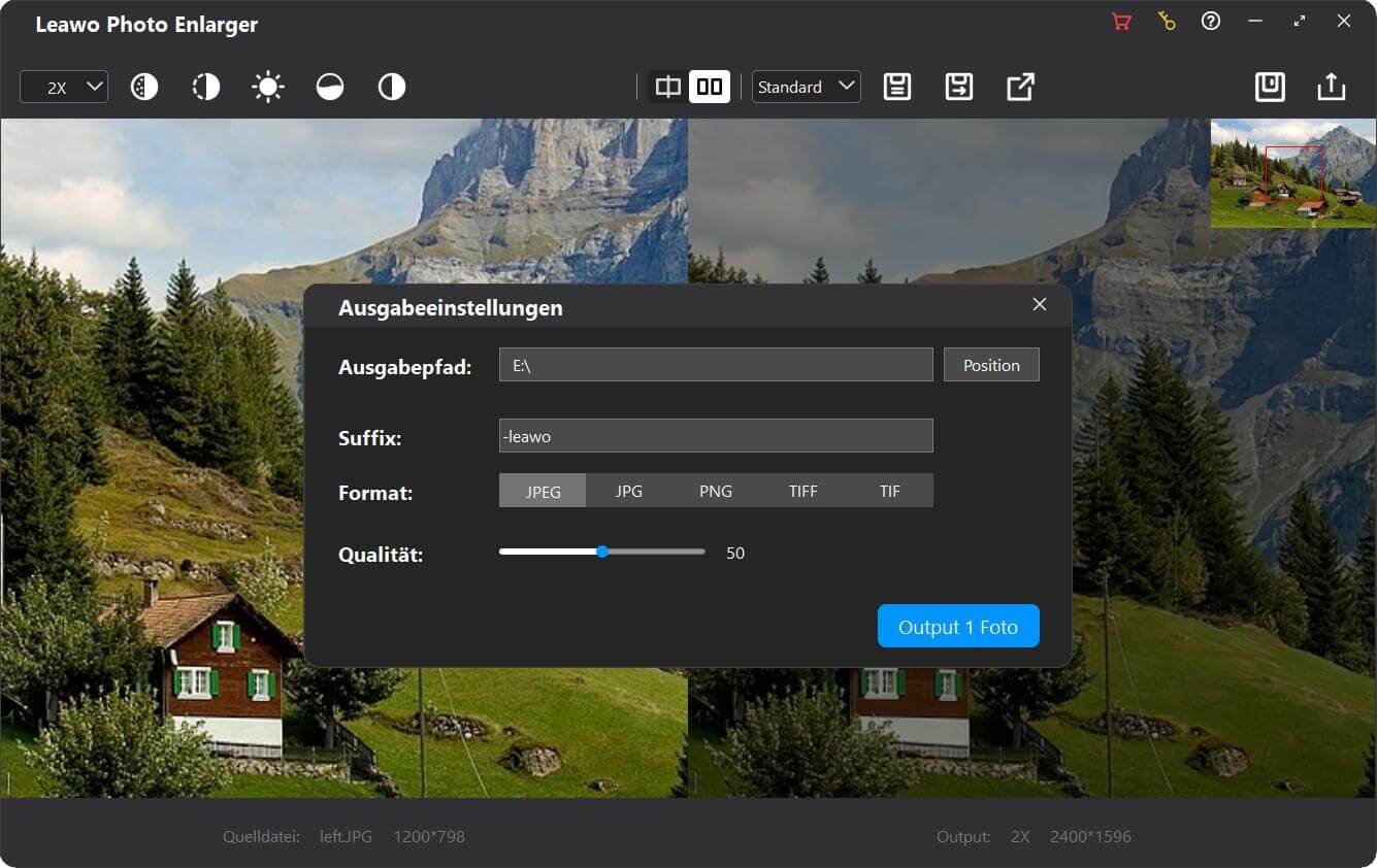 Oben rechts können Sie alle Änderungen speichern und zur Hauptschnittstelle von Leawo Photo Enlarger zurückkehren, sowie dieses Foto einzeln ausgeben: