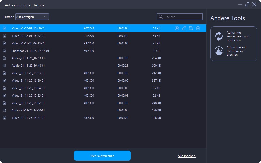 Wenn die Bildschirmaufnahme abgeschlossen ist, klicken Sie auf die Schaltfläche "Stop" , um die Aufnahme zu beenden. Sie können auch die Hotkeys drücken, die Sie zum Beenden der Aufnahme festgelegt haben. Standardmäßig sind die Hotkeys zum Beenden der Aufnahme "Ctrl + Alt + S". Im Bereich "Aufnahmehistorie" werden dann alle Aufnahmen mit Namen, Dimension (falls verfügbar), Dauer (falls verfügbar) und Größe aufgelistet. Außerdem können Sie auf das Kästchen vor "Verlauf" klicken, um alle Aufnahmen, d. h. Video-, Audio- oder Bildschirmaufnahmen, anzuzeigen, oder in der Suchleiste nach Aufnahmen suchen.