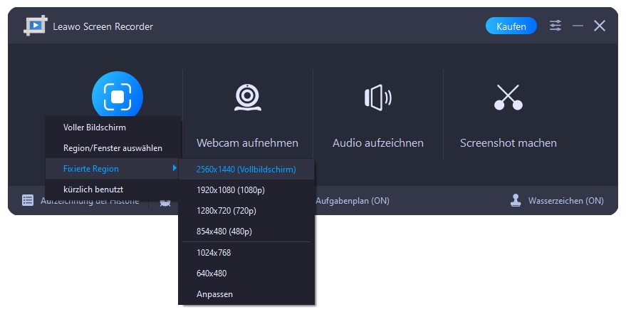 Wenn Sie auf der Hauptschnittstelle auf die Schaltfläche "Bildschirm aufnehmen" klicken, wird ein Dropdown-Menü angezeigt, in dem Sie den Aufnahmebereich zwischen Voller Bildschirm, Region/Fenster wählen, Fixierte Region oder Kürzlich benutzte Größe auswählen können.