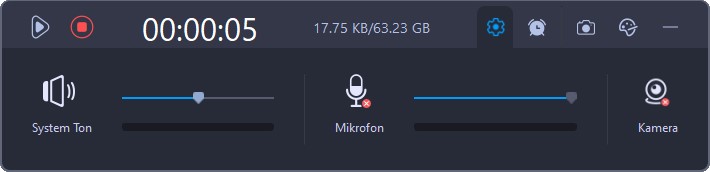 Wenn Sie während der Bildschirmaufzeichnung den "Systemton", das "Mikrofon" oder die "Kamera" aktivieren oder deaktivieren möchten, klicken Sie auf die Schaltfläche "Einstellungen" und dann auf das Symbol der jeweiligen Funktion, um die entsprechende Funktion zu aktivieren oder zu deaktivieren.