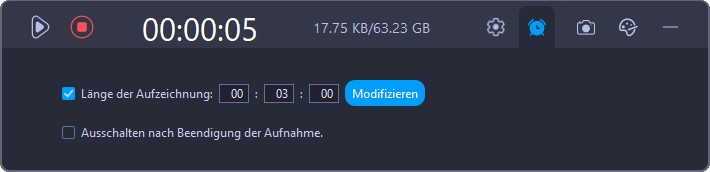 Um den Aufnahmevorgang zu planen, klicken Sie auf die Schaltfläche "Uhr" in der oberen Menüleiste und aktivieren Sie das Kontrollkästchen vor "Aufnahmedauer". Geben Sie dann die Zeit in die Kästchen ein oder klicken Sie auf die Schaltfläche "Modifizieren"