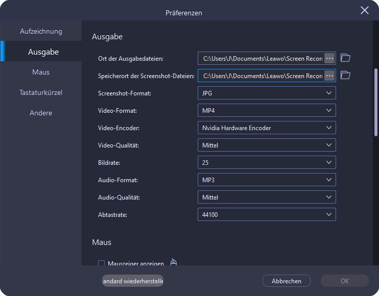 . Außerdem können Sie das Kontrollkästchen vor "Abschalten nach Ende der Aufnahme" aktivieren, damit sich das Programm nach Abschluss der Bildschirmaufnahme automatisch abschaltet.