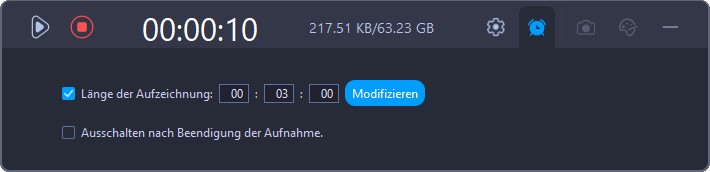 Um den Aufnahmevorgang zu planen, klicken Sie auf die Schaltfläche "Uhr" in der oberen Menüleiste und aktivieren Sie das Kontrollkästchen vor "Aufnahmedauer". Geben Sie dann die Zeit in die Kästchen ein oder klicken Sie auf die Schaltfläche "Modifizieren"