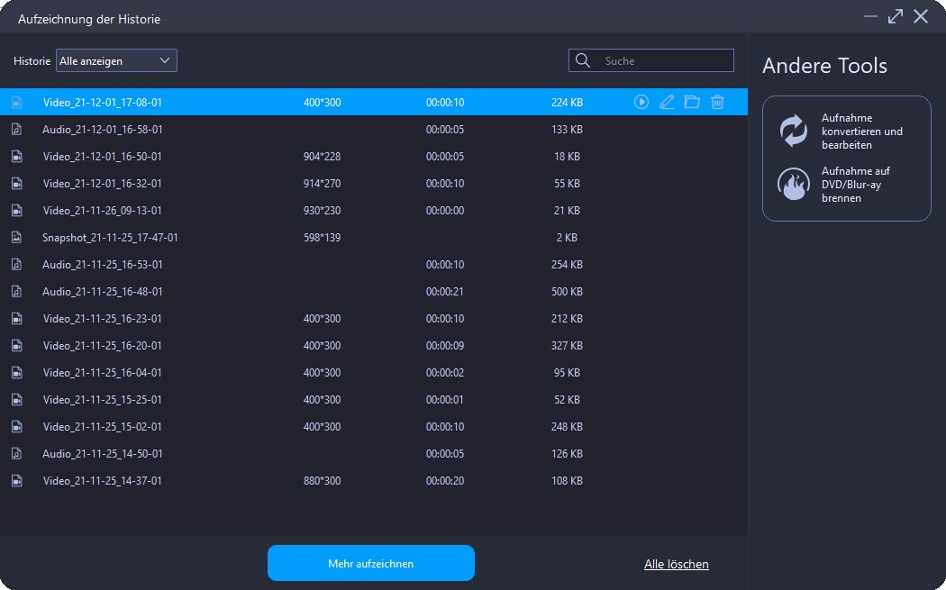 Wenn die Webcam-Aufnahme abgeschlossen ist, klicken Sie auf die Schaltfläche "Stop" , um die Aufnahme zu beenden. Sie können auch die Hotkeys drücken, die Sie zum Beenden der Aufnahme festgelegt haben. Standardmäßig sind die Hotkeys zum Beenden der Aufnahme "Ctrl + Alt + S". Im Bereich "Aufnahmehistorie" werden dann alle Aufnahmen mit Namen, Dimension (falls verfügbar), Dauer (falls verfügbar) und Größe aufgelistet. Außerdem können Sie auf das Kästchen vor "Verlauf" klicken, um alle Aufnahmen, d. h. Video-, Audio- oder Bildschirmaufnahmen, anzuzeigen, oder in der Suchleiste nach Aufnahmen suchen.