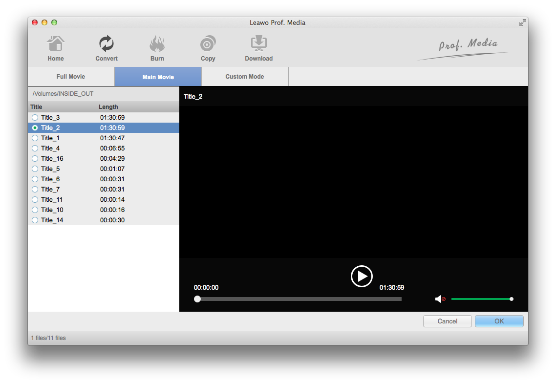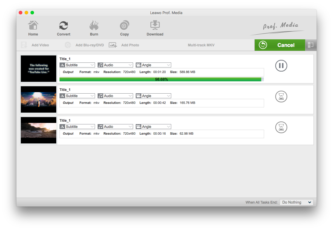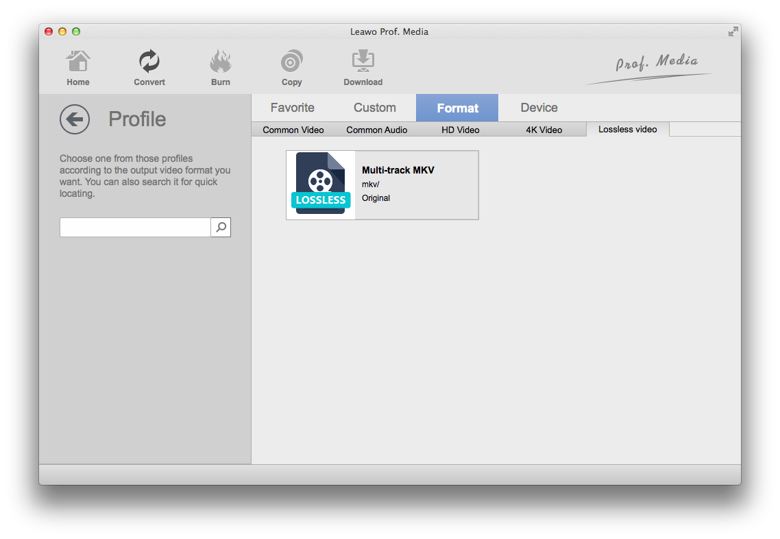 Leawo Prof. Media 13 für Mac enthält verschiedene Blu-ray/DVD-Verarbeitungsmodule und ein Videokonvertierungsmodul, das Ihnen helfen kann, gängige und Multi-Angle Blu-rays/DVDs in gängige Videodateien zu konvertieren und Videos zwischen verschiedenen Formaten zu konvertieren. Erfahren Sie, wie Sie Blu-ray/DVD/Video in den folgenden Inhalten konvertieren können.