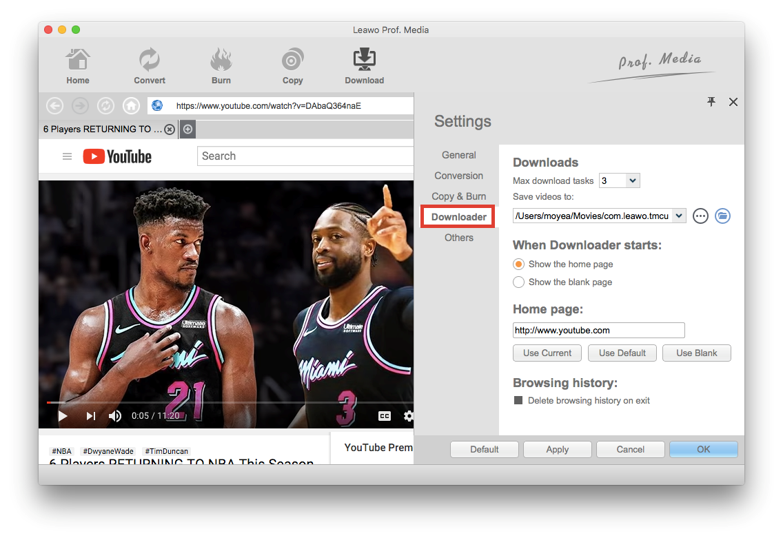 Bevor Sie jedoch die Videos herunterladen, sollten Sie den Zielordner für das Speichern von Videos anpassen. Wählen Sie einfach " Einstellungen... " im Softwaremenü und wechseln Sie vom rechten Rand des Popup-Fensters Einstellungen zur Registerkarte " Downloader ". Klicken Sie dann auf die Schaltfläche mit den drei Punkten, um zu browsen und den Speicherpfad auszuwählen. Klicken Sie abschließend auf die Schaltfläche OK, um die Einstellungen zu speichern.