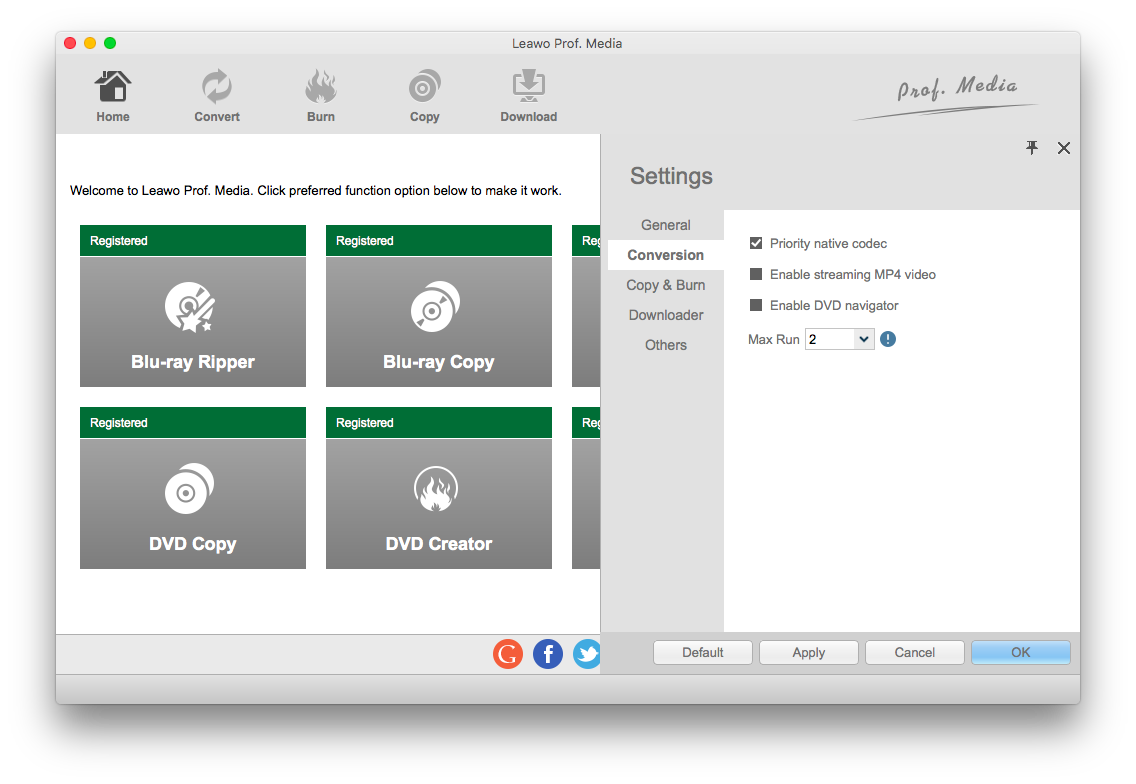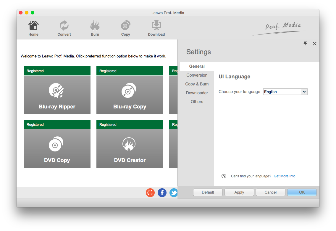 Wählen Sie in der Menüleiste von Prof. Media 13 for Mac "Leawo Prof. Media > Einstellungen..." und dann erscheint am rechten Rand ein Einstellungsbereich. Es gibt 5 Optionen: Allgemeine, Konvertieren, Kopieren & Brennen, Downloader und andere.