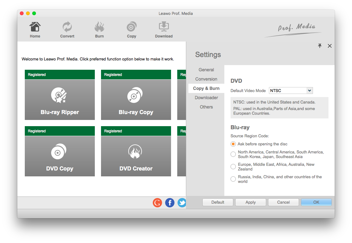 Öffnen Sie die Registerkarte " Kopieren & Brennen ", um Einstellungen an den Modulen Kopieren und Brennen vorzunehmen. Sie können den DVD-Videomodus aus NTSC und PAL auswählen, indem Sie auf das Dropdown-Menü Standard-Videomodus klicken, und den Blu-ray Regionscode für das Brennen von Blu-ray-Inhalten festlegen, indem Sie eine der unten aufgeführten Optionen auswählen.