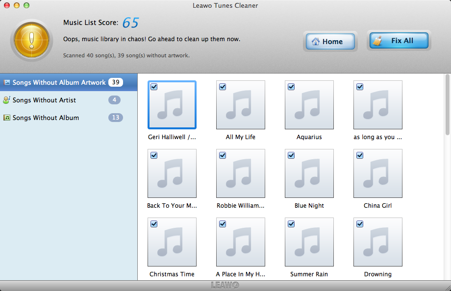 Die Software scannt iTunes Musikdateien automatisch. Damit werden alle Musikdateien mit unterschiedlichen Problemen in bestimmten Kategorien in der linken Seitenleiste angezeigt. Sie können jede zu aufräumendene Datei auswählen oder einfach auf die Schaltfläche "Alle aufräumen"