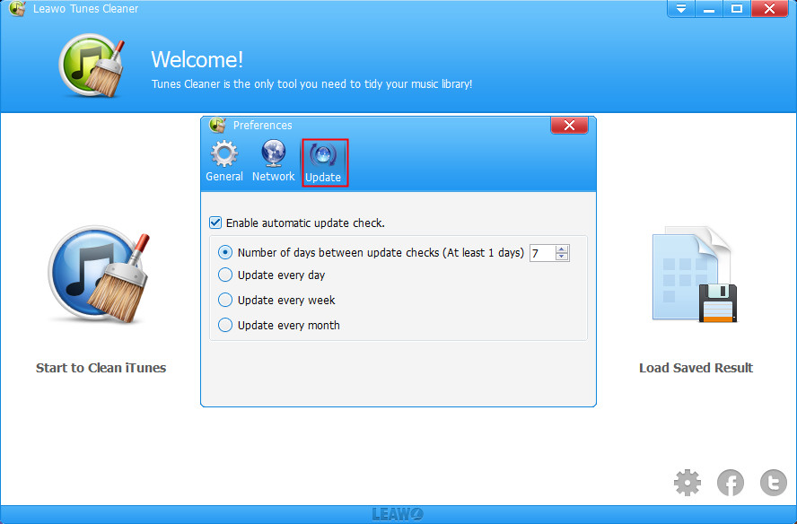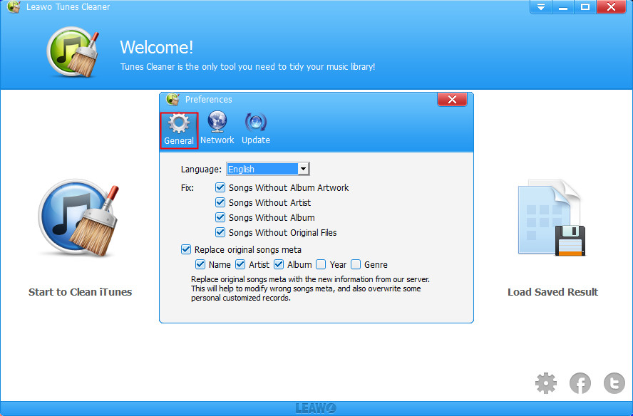 Schritt 1. Auf der Hauptschnittstelle von Leawo Tunes Cleaner finden Sie das Einstellungssymbol rechts unten im Fenster Tunes Cleaner und klicken bitte auf das Symbol, um das Einstellungsmenü zu öffnen.
