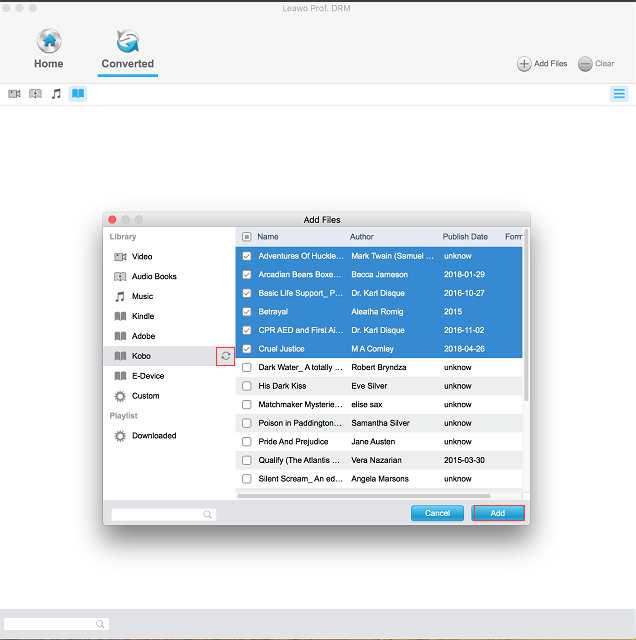 auf der Schaltfläche “Kobo”. Alle heruntergeladenen Bücher in Ihrer Kobo-Bibliothek werden im rechten Rahmen aufgelistet. Wählen Sie das Buch, das Sie konvertieren möchten und klicken Sie auf “Hinzufügen”, um es in das Programm zu laden.