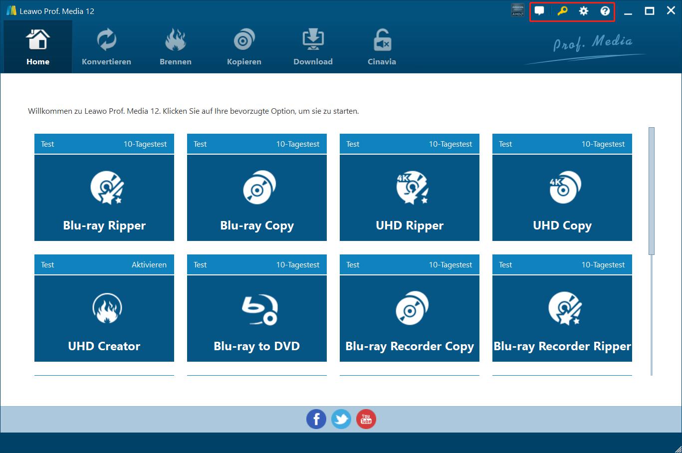 In der oberen rechten Ecke von Leawo Prof. Media sehen Sie einige Symbole, die im Folgenden näher beschrieben werden: