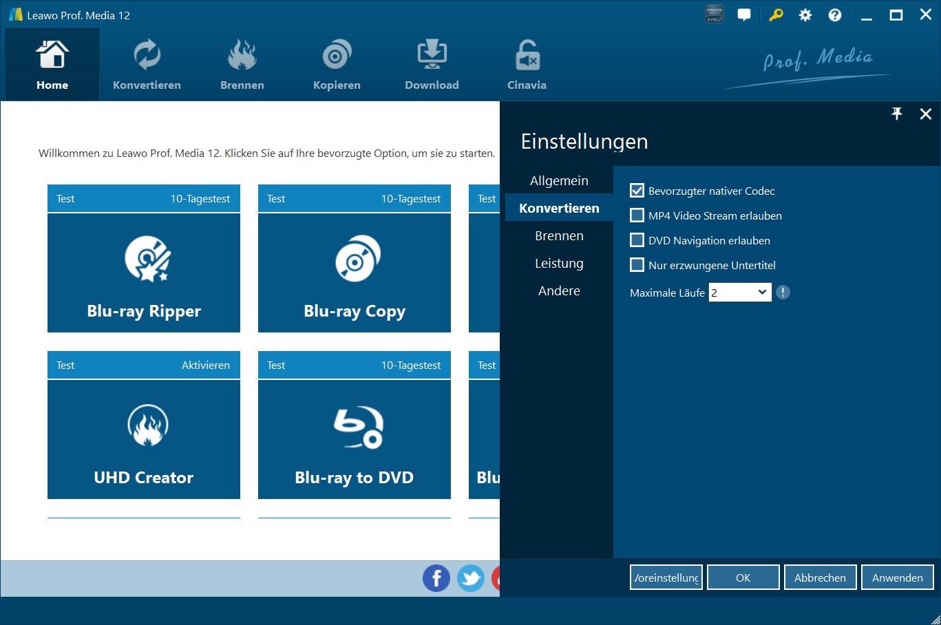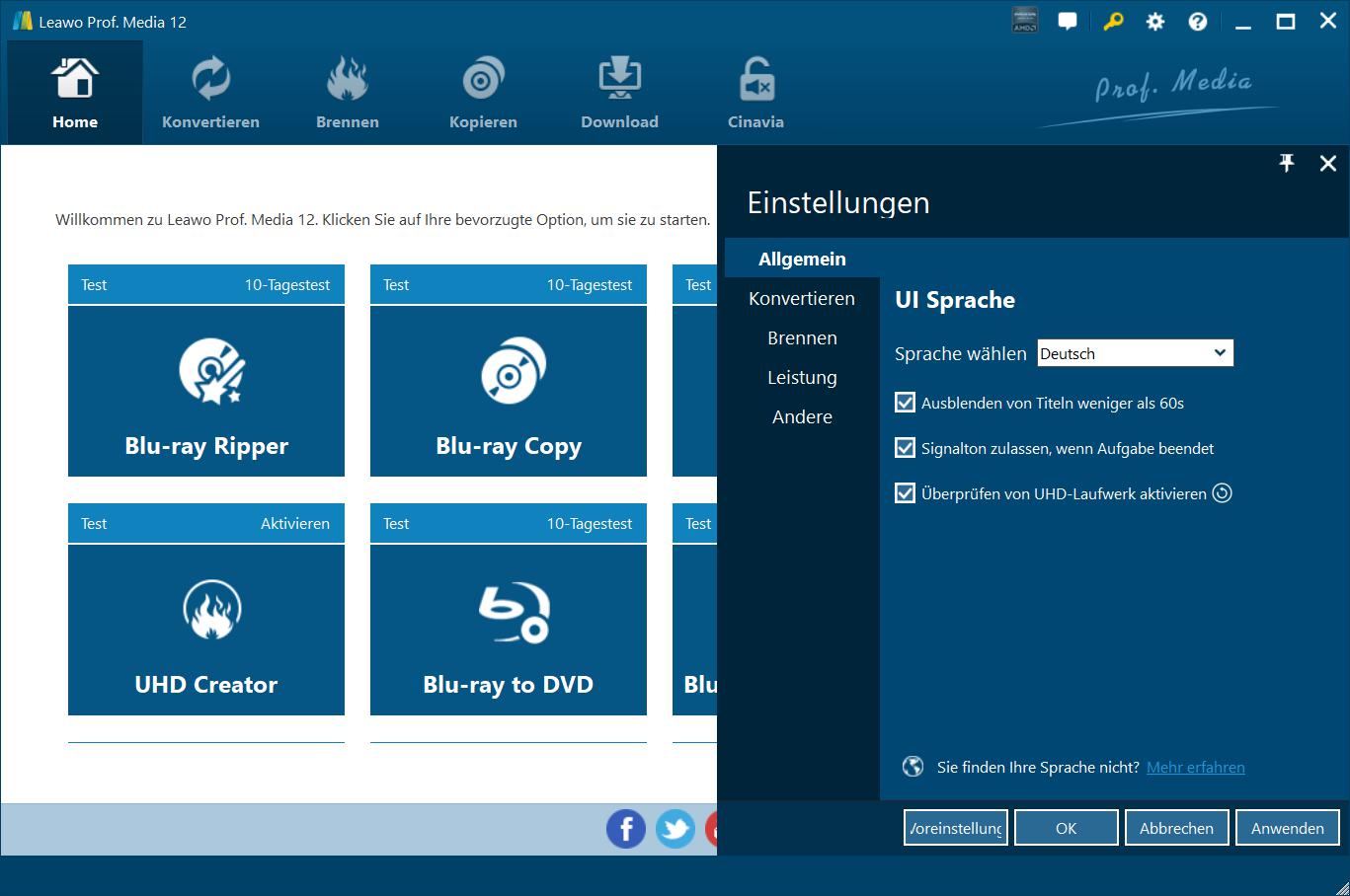 Leawo Prof. Media bietet Ihnen zahlreiche Programmeinstellungen, damit Sie dieses Programm besser nutzen können. Sie können auf das Symbol "Einstellungen" klicken und Leawo Prof. Media einstellen, einschließlich:
