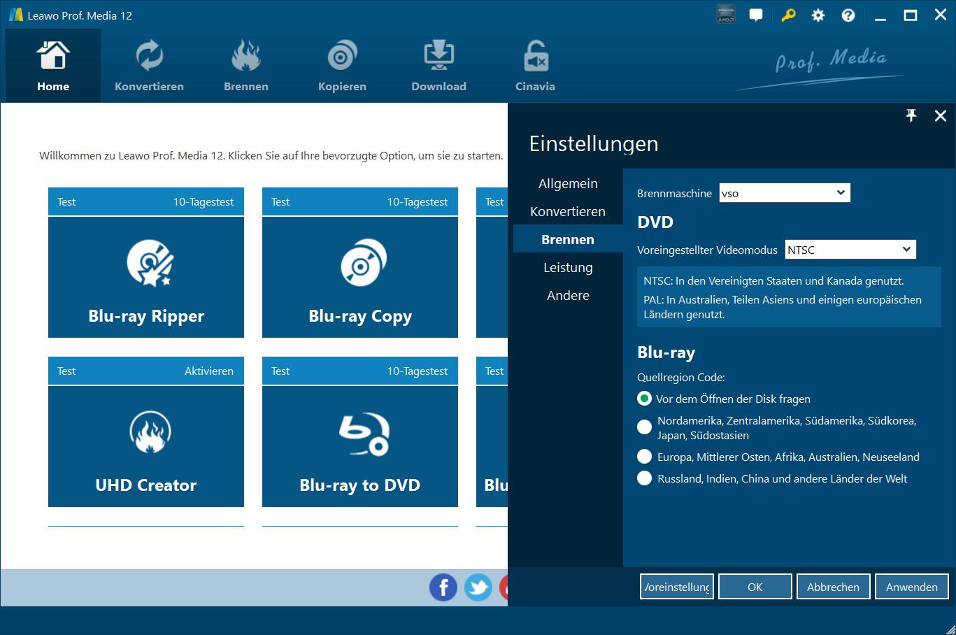 Auf der Registerkarte "Kopieren und Brennen" können Sie Brennmaschine, Standard-Videomodus für DVDs, Regionalcode der Blu-ray-Quelle usw. einstellen.