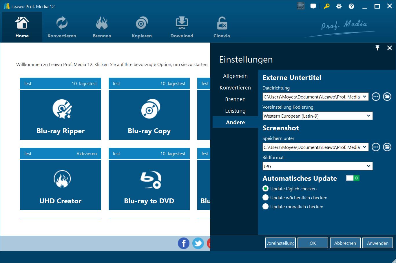 Auf der Registerkarte "Andere" können Sie Position der externen Untertitel, Standardkodierung, Verzeichnis und Format zum Speichern von Screenshots, automatische Aktualisierung usw. bestimmen.