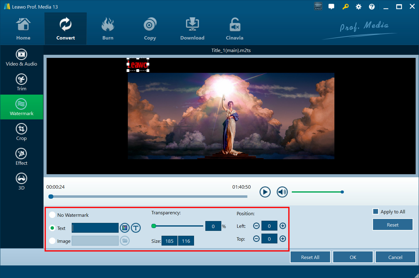 Wechseln Sie in den Bereich "Wasserzeichen", aktivieren Sie die Schaltfläche "Wasserzeichen" in grüner Farbe und fügen Sie entweder Text oder ein Bild als Video-Wasserzeichen hinzu. Transparenz des Wasserzeichens, linker Rand, oberer Rand und Bildgröße sind einstellbar. Markieren Sie "Auf alle anwenden", um das Wasserzeichen zu allen Videos hinzuzufügen. Drücken Sie "OK" zum Bestätigen.
