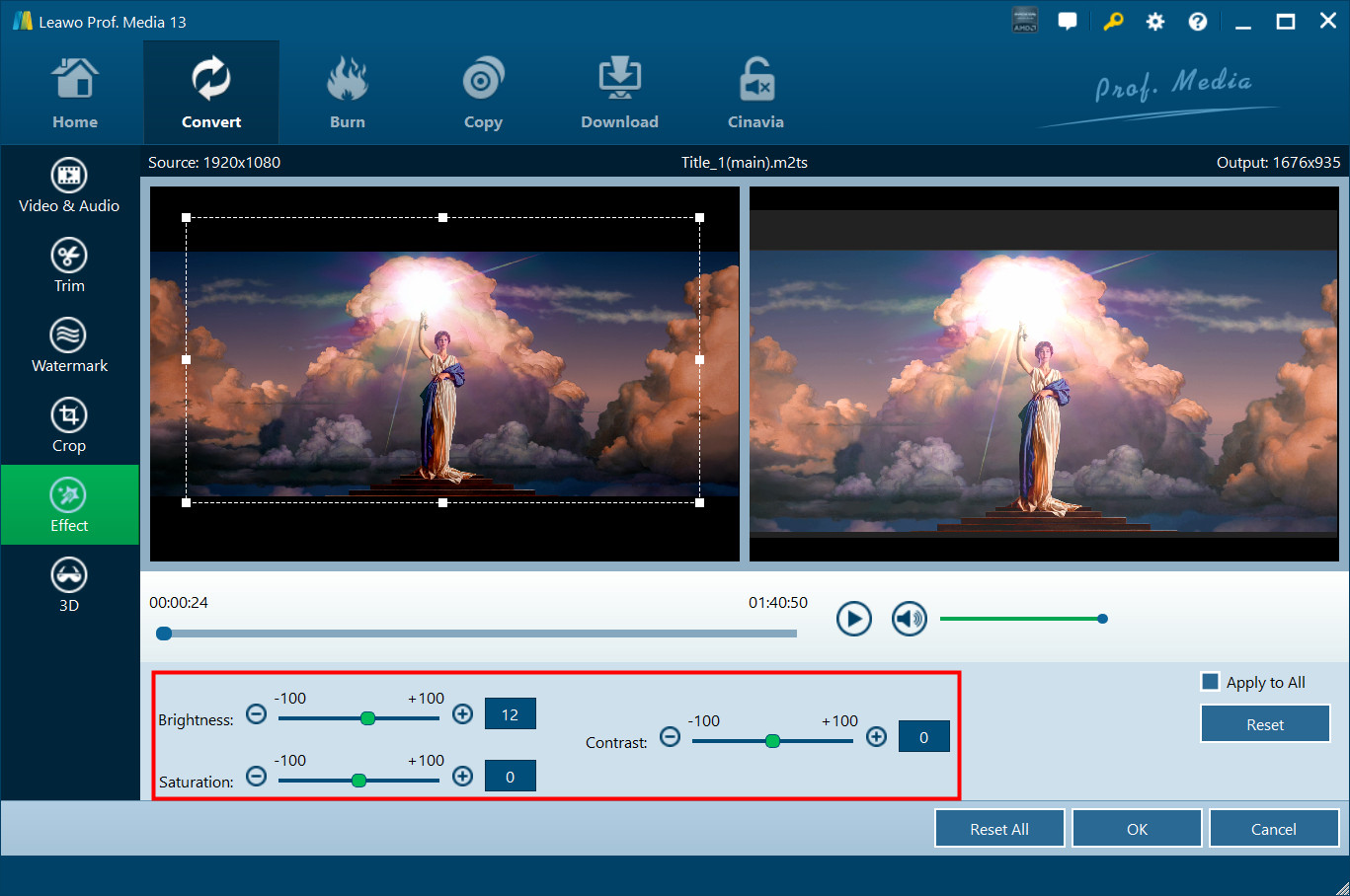 Gehen Sie in den Bereich "Effekt" und ziehen Sie direkt die Folien von "Helligkeit", "Kontrast", "Sättigung" und "VolumeZoom(%)" für einen speziellen Videoeffekt. Markieren Sie "Auf alle anwenden", um die Effekteinstellungen auf alle Ihre geladenen Dateien anzuwenden. Mit " OK" wird bestätigt.