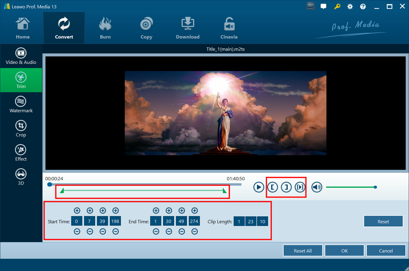 Im Bereich "Trimmen" können Sie den Schieberegler direkt ziehen, um die Videolänge zu trimmen, oder manuell Werte in die Felder "Startzeit" und "Endzeit" eingeben. Die Cliplänge kann sofort angezeigt werden. Setzen Sie sie zurück oder klicken Sie auf "OK" zum Bestätigen.