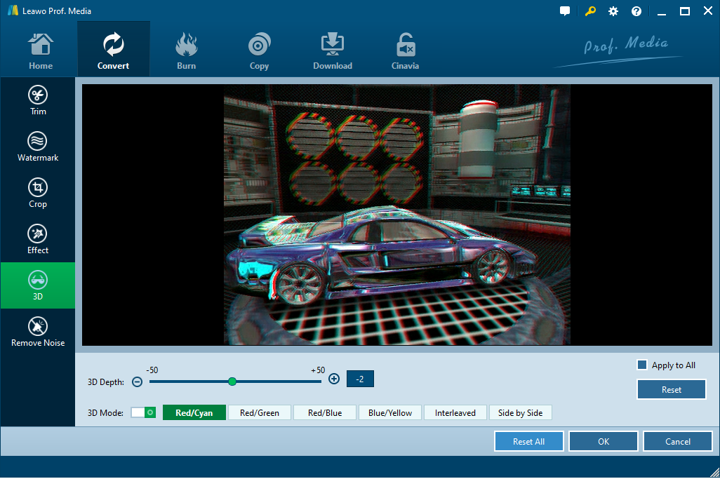 Öffnen Sie im Video-Bearbeitungsfenster die Registerkarte “3D” und schieben Sie den “3D-Modus” auf grün. Sie können dann einen 3D-Effekt wählen, der auf die endgültige Videodatei angewendet wird. Insgesamt stehen Ihnen 6 verschiedene 3D-Filmeffekte zur Auswahl: Rot/Cyan, Rot/Grün, Rot/Blau, Blau/Gelb, Interleaved und Side by Side. Wählen Sie eine entsprechend der 3D-Brille, mit der Sie 3D-Videos ansehen möchten. Für einen lebendigeren 3D-Effekt können Sie sogar direkt die Folie ziehen oder die Werte in 3D-Tiefe einstellen, um die 3D-Tiefe anzupassen. Aktivieren Sie “Auf alle anwenden”, um den ausgewählten 3D-Filmeffekt auf alle Videodateien anzuwenden.