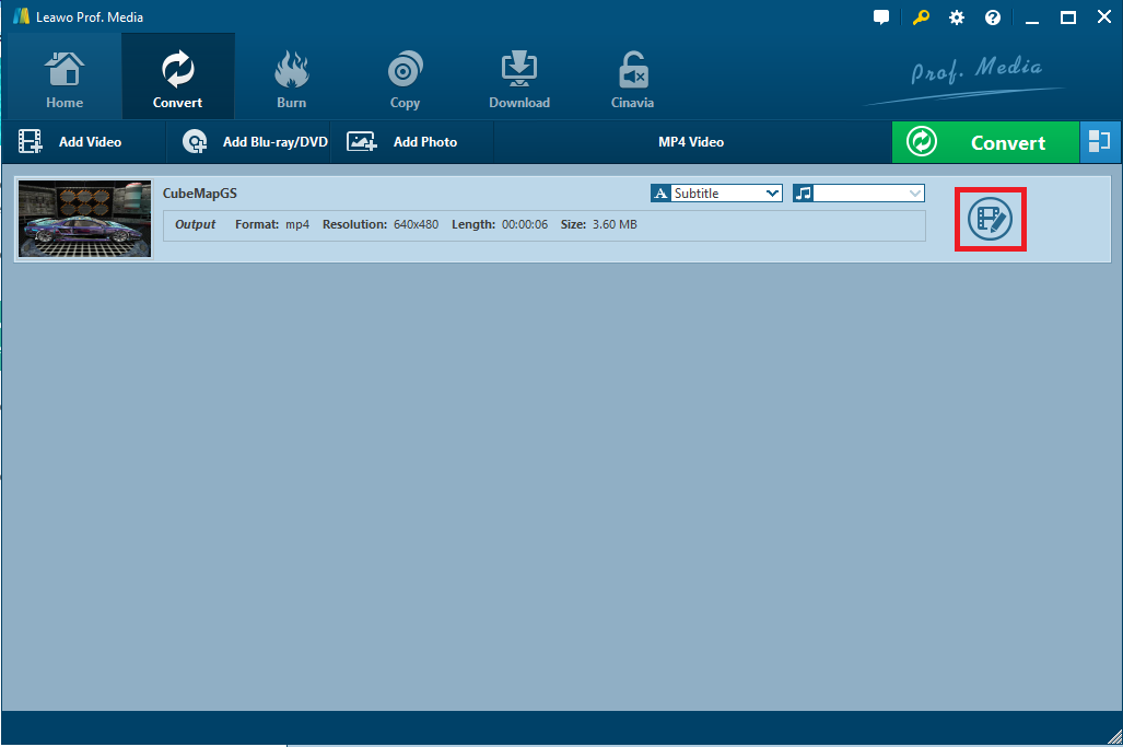 Nachdem Sie die Quellvideodatei geladen haben, klicken Sie auf das Symbol “Bearbeiten” rechts neben dem Videotitel auf dem Bearbeitungsfenster. Dann werden Sie in ein Video-Vorschaufenster geführt, wo Sie das Video für die Ausgabedatei bearbeiten und anpassen können.