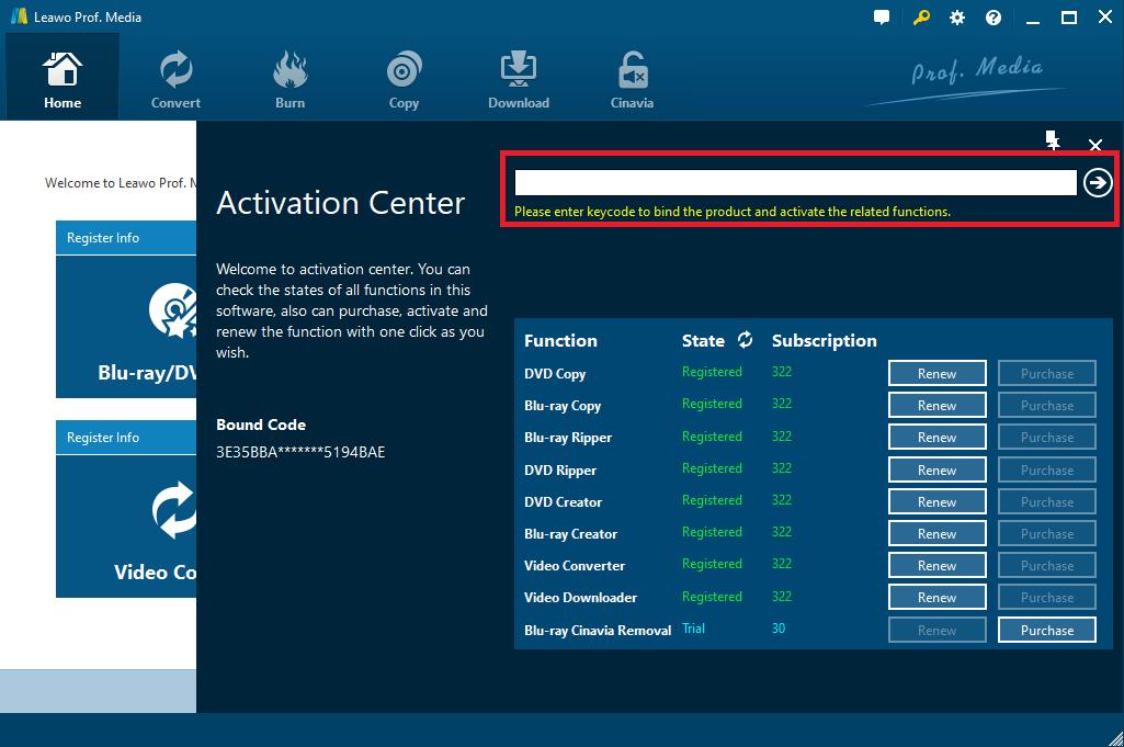Um die unbegrenzten Funktionen von Leawo Video Converter zu genießen, müssen Sie einen Registrierungscode erwerben, um die registrierte Version zu erhalten. Klicken Sie auf das Schlüsselsymbol