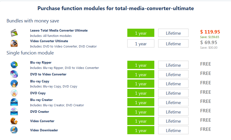 Nach dem Anklicken der Schaltfläche Kaufen gelangen Sie zur Kaufseite von Leawo Prof. Media. Auf der Seite können Sie den Registrierungscode für alle in Prof. Media enthaltenen Module oder ein einzelnes Modul erwerben. Um das Video Downloader Modul zu kaufen, stornieren Sie einfach die Auswahl der anderen Module und wählen Sie die Validierung zwischen 1 Jahr und der Lifetime. Gehen Sie dann nach unten auf der Seite und klicken auf Sofort zur Kasse