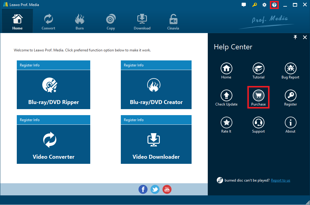 b. Die zweite Möglichkeit besteht darin, dass Sie auf die Schaltfläche Hilfe klicken, um das Hilfecenter aufzurufen. Klicken Sie dann auf Registrieren, wenn Sie den Code haben. Oder klicken Sie auf Kaufen, um ihn zu erwerben.