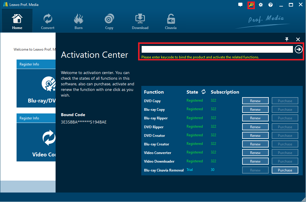 a. Wenn Sie bereits einen Registrierungscode haben, klicken Sie einfach auf die Schaltfläche Registrieren, um das Aktivierungscenter zu öffnen und Ihren Code in das Codefeld einzugeben. Wenn Sie den Code nicht haben, klicken Sie auf die Kaufen-Schaltfläche des Video-Downloaders in der Modulliste unten und es wird Sie direkt auf die Kaufseite führen.