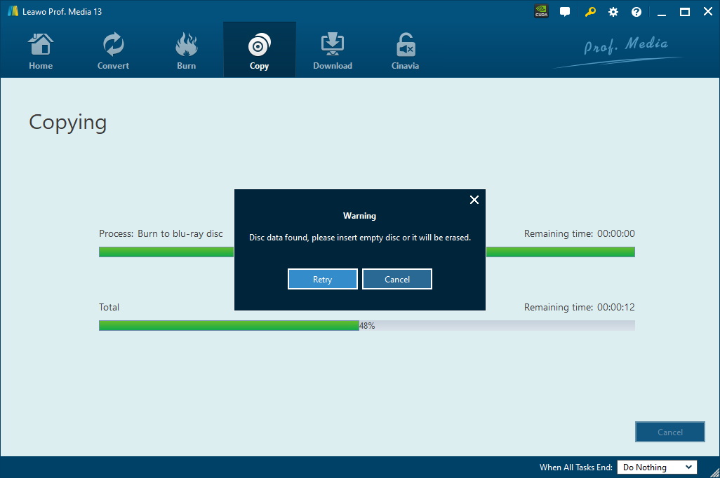 1. Leawo DVD Copy could help you copy DVD content between disc and computer. If you want to copy DVD disc to another blank disc but have only one disc drive, you need to firstly choose to copy to disc drive (next to the "ISO File" option) on the "Copy to" sidetab mentioned in Step 4. Then, once the copy process completes, there will pop up a notice to let you eject the source disc and then insert a blank writable disc or rewritable disc into the disc drive for copying.
