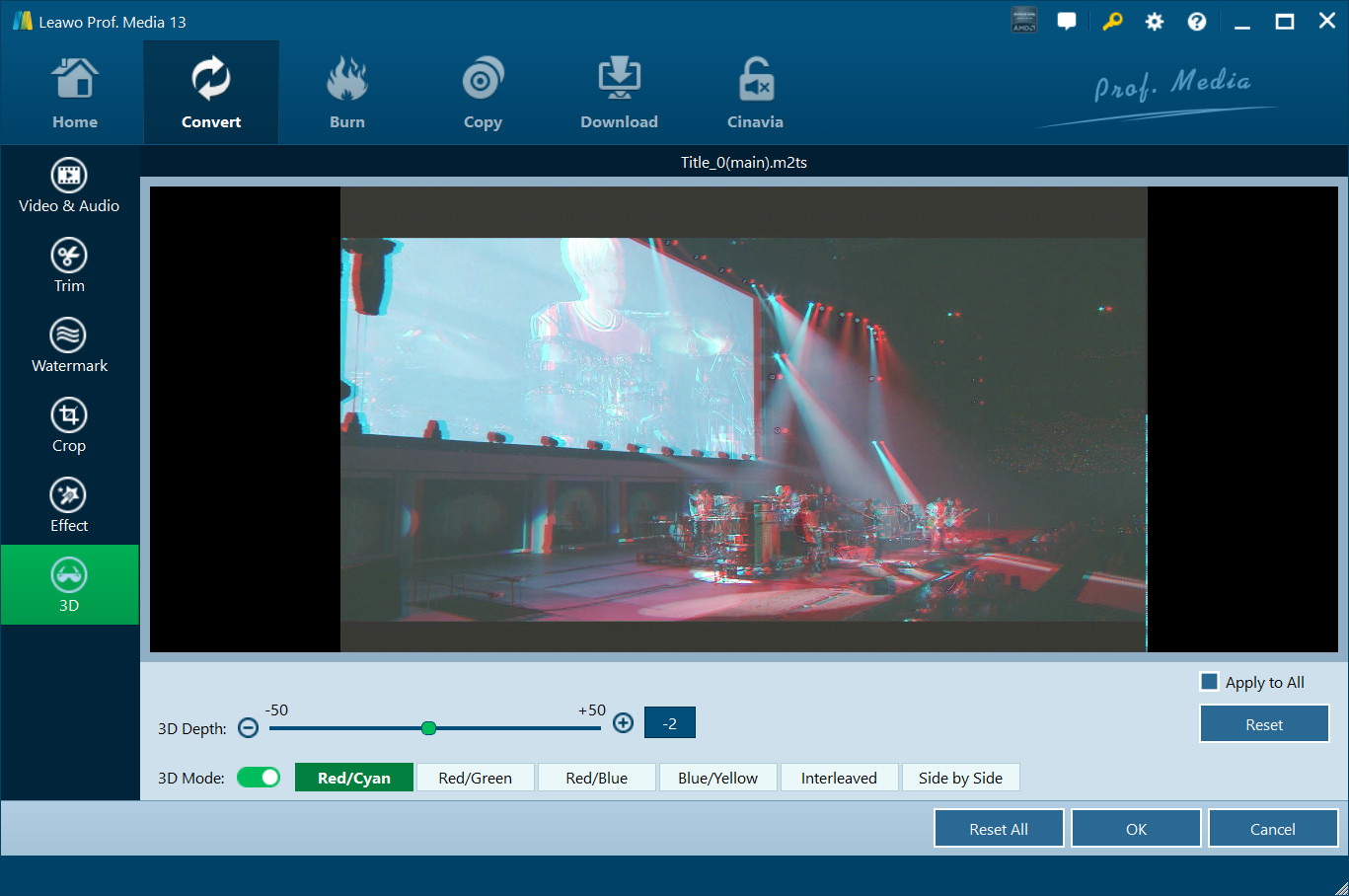 On the video editing panel, open the "3D" tab and then slide the "3D Mode" to green. You could then choose a 3D effect to apply to the final video file. There are in total 6 different 3D movie effects available for you to choose from: Red/Cyan, Red/Green, Red/Blue, Blue/Yellow, Interleaved, and Side by Side. Select one according to the 3D glasses you are using to enjoy 3D videos. For more vivid 3D effect, you could even directly drag the slide or set values in 3D Depth to adjust 3D depth. Tick "Apply to all" to apply selected 3D movie effect to all video files.