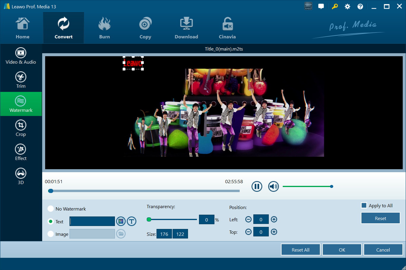 Switch to “Watermark” section, enable the Watermark button to green, and then you are allowed to add either Text or Image as video watermark. Watermark Transparency, Left Margin, Top Margin, Image Size are adjustable. Check "Apply to all" to add watermark to all videos. Press "OK" to confirm it.
